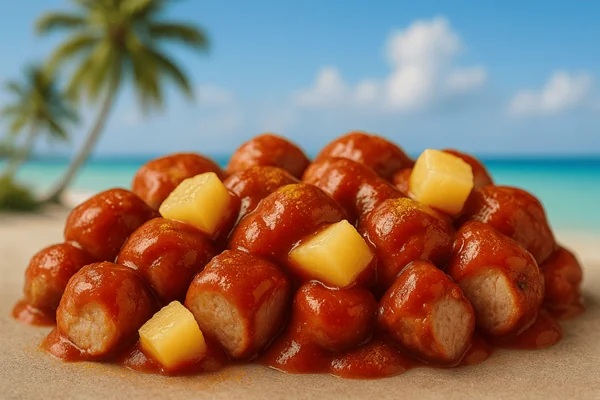 Unsere Ananaswurst ist kein Gag, sondern eine ernsthafte kulinarische Idee. Viele kennen Toast Hawaii, aber eine echte Currywurst mit Ananas ist das nächste Level. Die Säure der Frucht harmoniert perfekt mit dem Fett der Wurst und macht das Gericht leichter und sommerlicher. In der Sauce findest du echte Fruchtstücke, die für einen tollen Biss sorgen.
